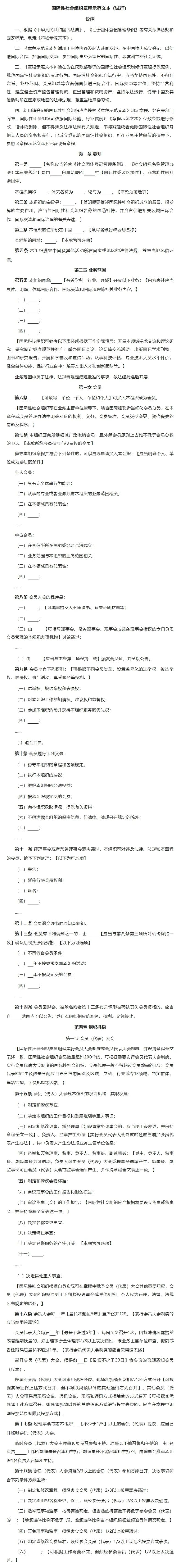 民政部关于印发《国际性社会组织章程示范文本(试行)》的通知
