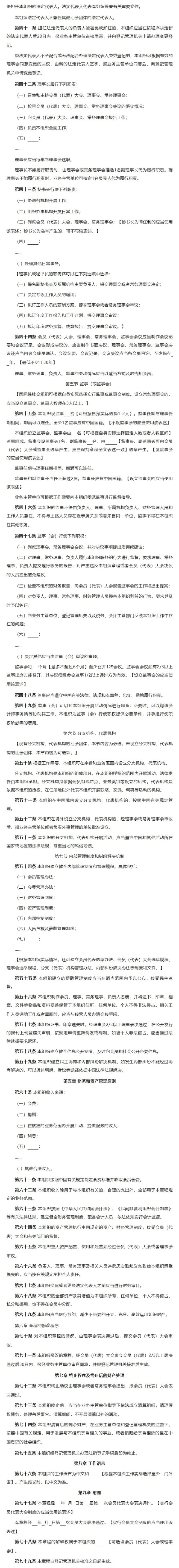 各国际性社会组织要依据《章程示范文本》修改章程,强化规则意识,做到依章程办事,按章程要求开展活动,持续健全工作制度,持续提升治理能力。在执行过程中如有问题或建议,请及时向民政部反馈。