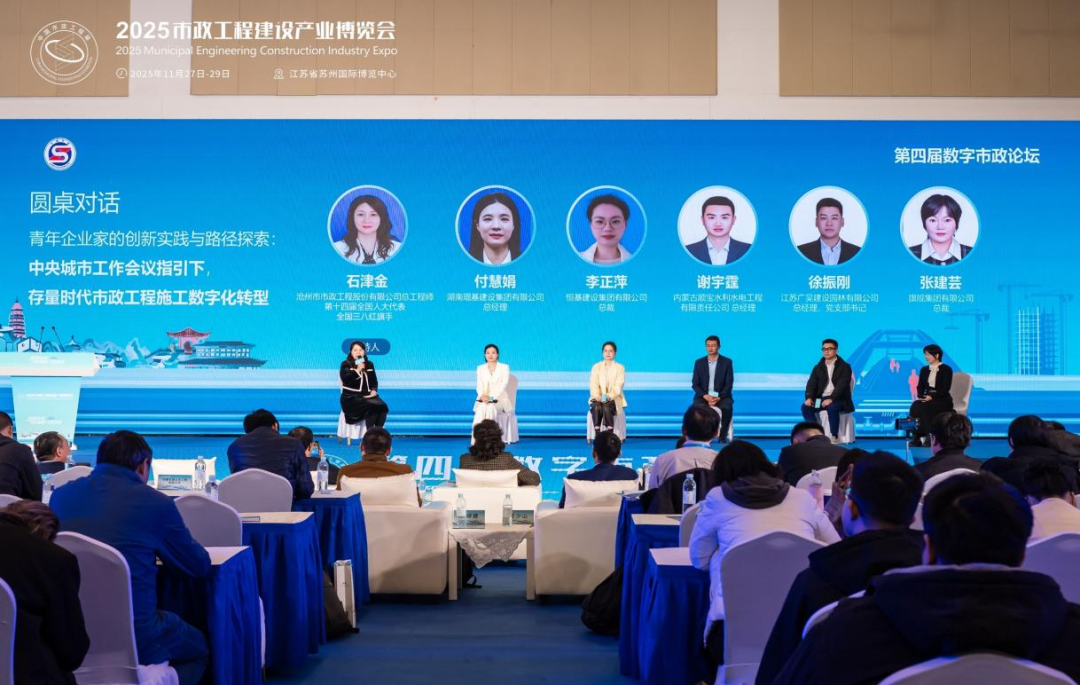 本次论坛特设的青年企业家圆桌对话环节,由沧州市市政工程股份有限公司总工程师、第十四届全国人大代表、全国三八红旗手石津金主持,湖南琨基建设集团有限公司付慧娟、恒基建设集团有限公司李正萍、内蒙古顺宝水利水电工程有限责任公司谢宇霆、江苏广吴建设园林有限公司徐振刚、旗舰集团有限公司张建芸,围绕“中央城市工作会议指引下,存量时代市政工程施工数字化转型”展开深度研讨,各位嘉宾立足行业实践,展现了新一代产业领袖如何将AI、BIM、大数据等数字技术深度融合于施工场景,以创新实践回应时代命题。